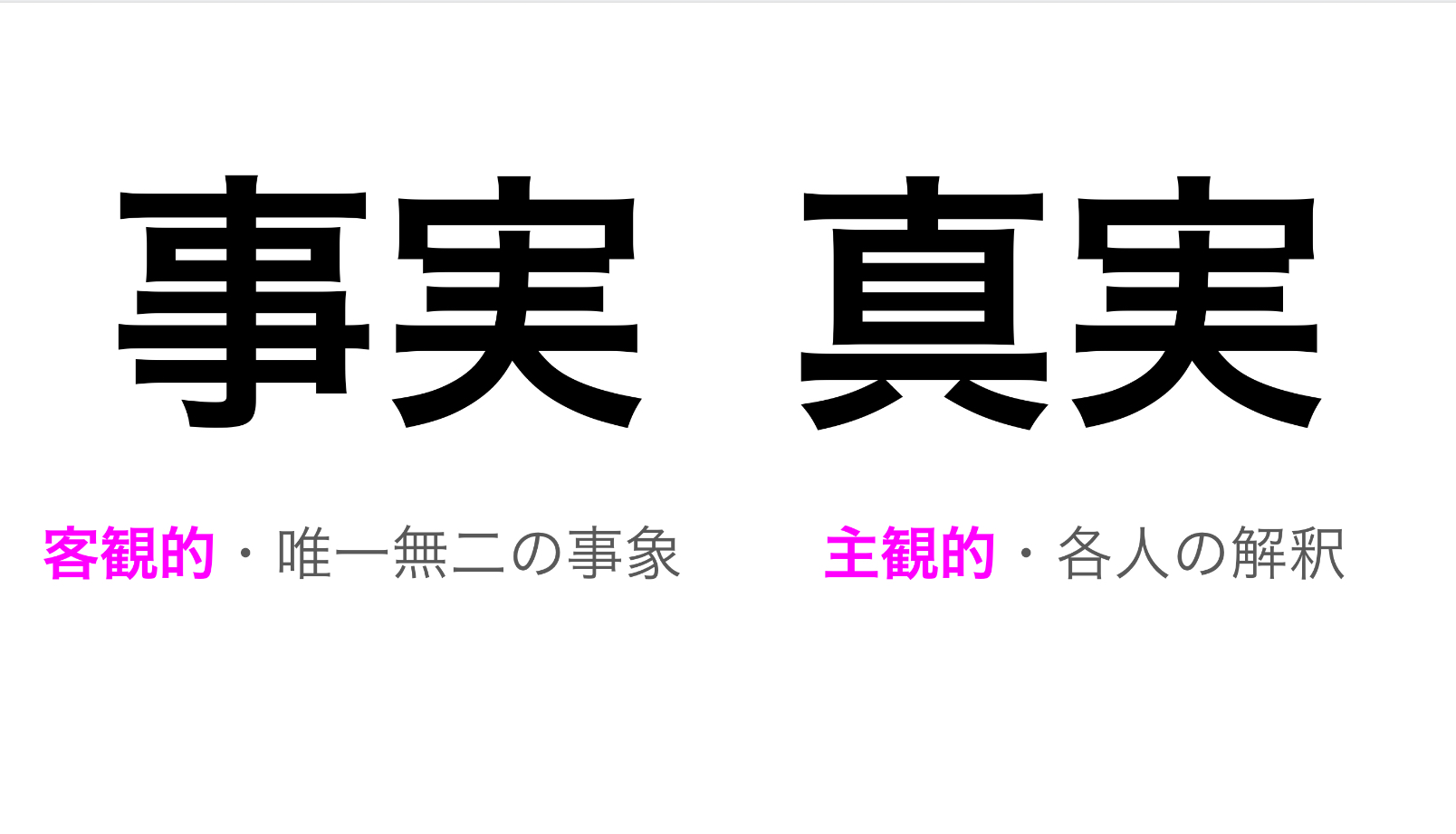 私は研修講師をやっているので、その研修では必ず伝えていることがある。それは【事実と真実】の違いであり、それは私たちの主観がどれほど根強く思考に癖があるのか、ということ。