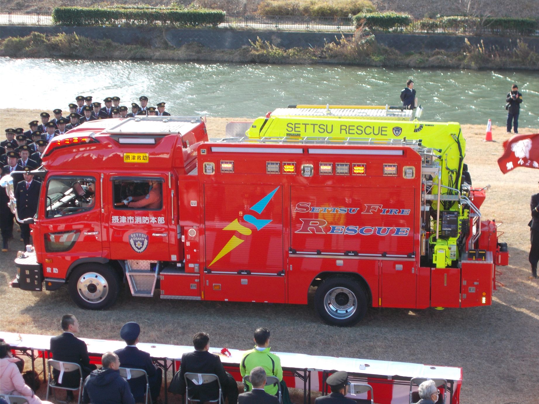 ↓摂津市に新たに導入された消防車もお披露目されました。🚒💨