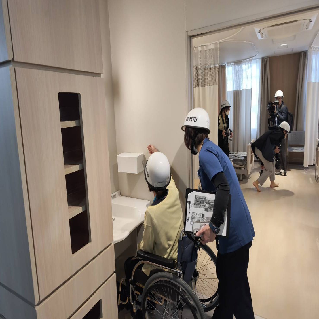 今回の見学で特に印象的だったのは、建築途中の段階にもかかわらず、医療スタッフ自らが車椅子に乗り、動線確認を行っていたことです。