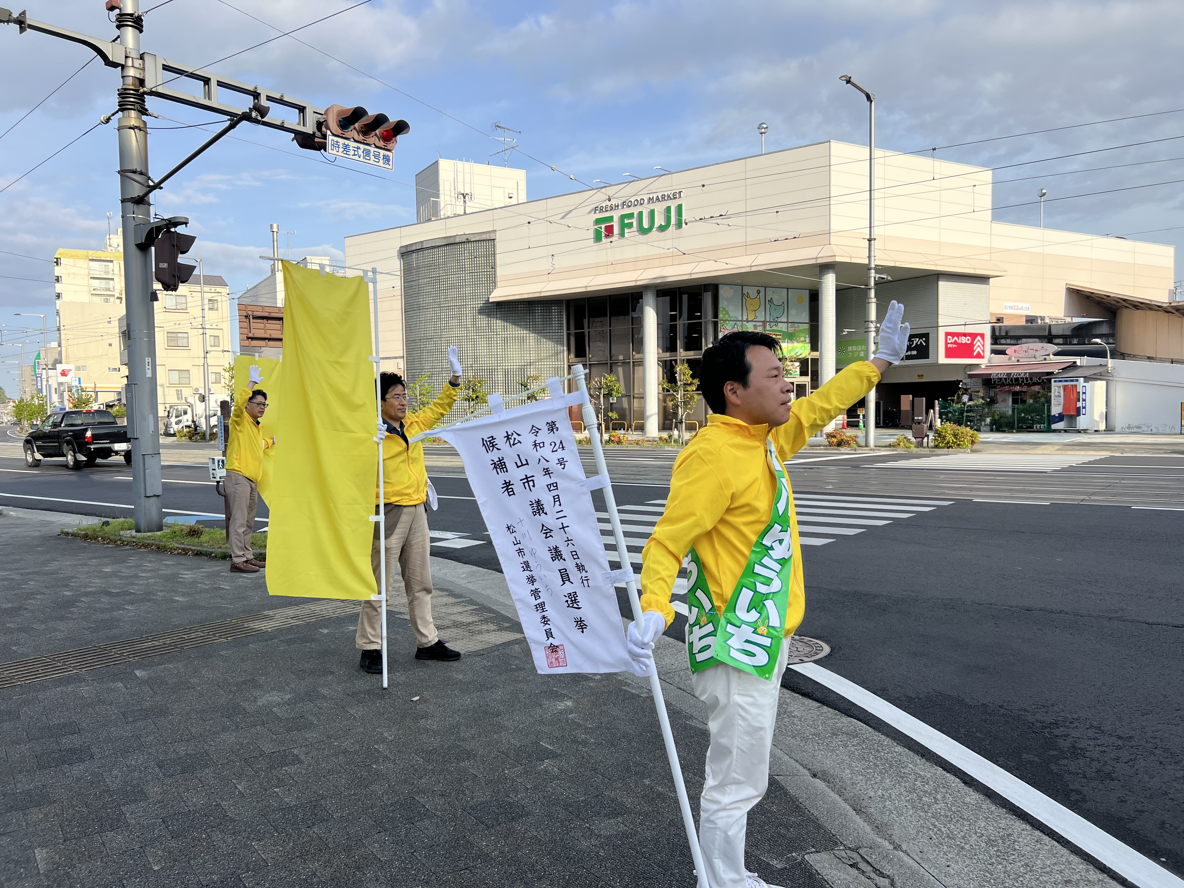 ホーム>政党・政治家>十川 ゆういち (ソガワ ユウイチ)>十川ゆういち【松山市議選】道後交差点の街頭活動からスタート!16か所まわります!