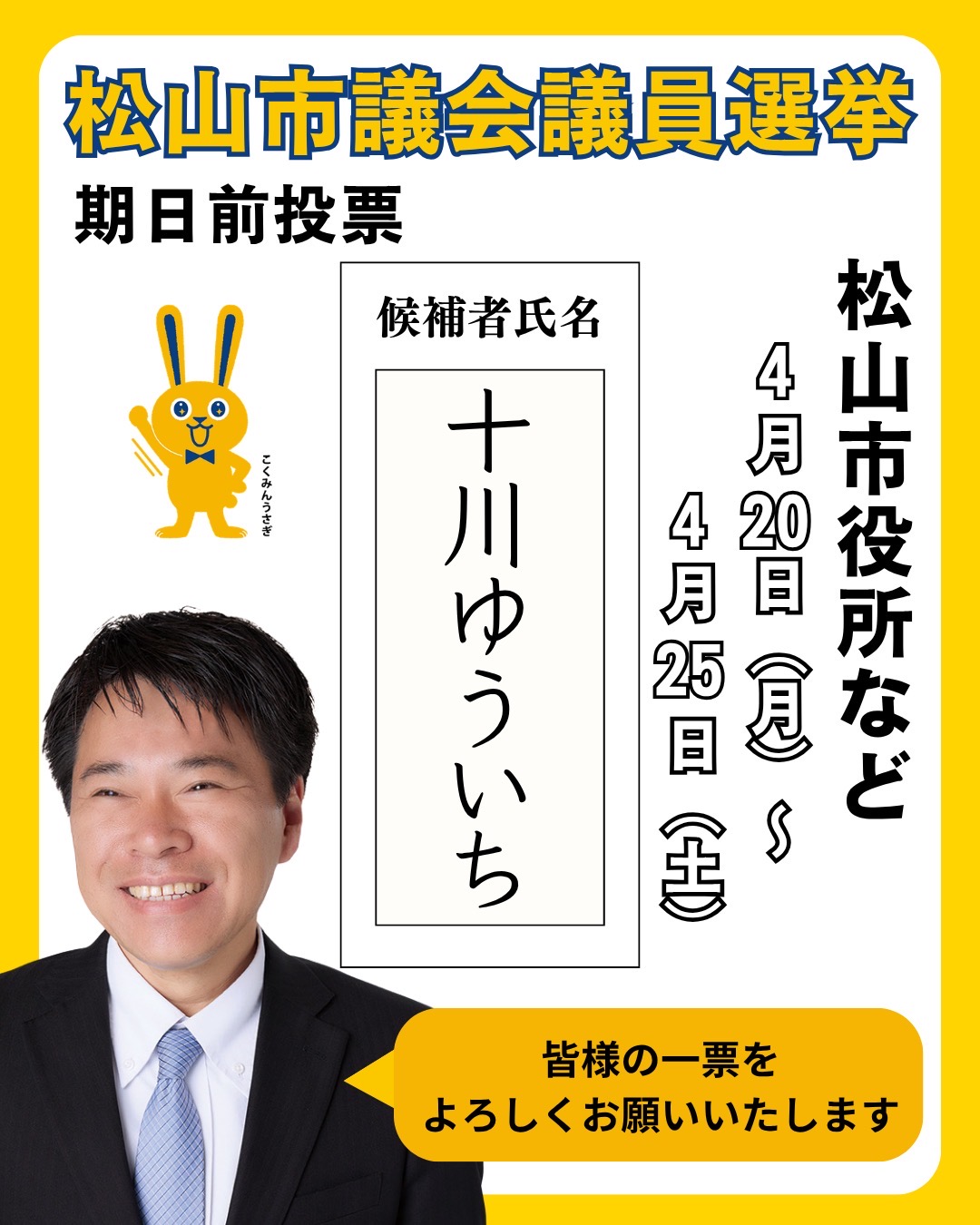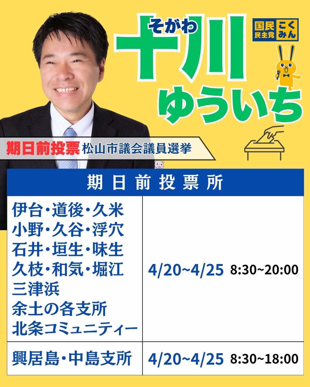 ホーム>政党・政治家>十川 ゆういち (ソガワ ユウイチ)>十川ゆういち【松山市議選】期日前投票の場所と時間について(フジグラン松山、いよてつ高島屋など)