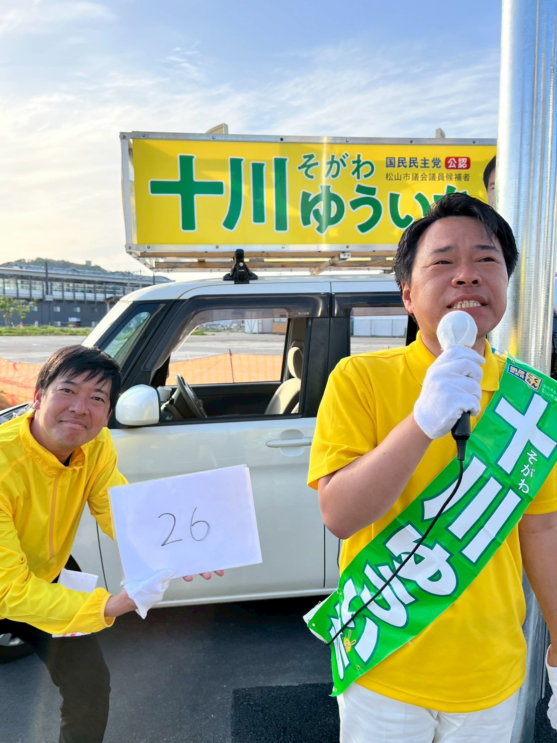 ホーム>政党・政治家>十川 ゆういち (ソガワ ユウイチ)>十川ゆういち【松山市議選】30か所挑戦、26か所目突破!中村、フジグラン松山、フジ藤原店へ