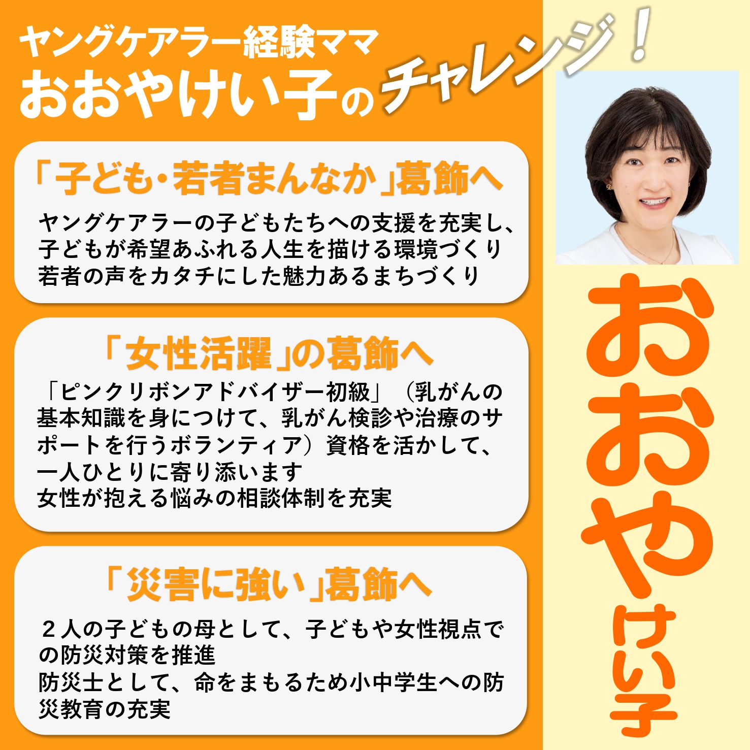 ホーム>政党・政治家>おおや けい子 (オオヤ ケイコ)>【葛飾区議会議員選挙候補 おおやけい子】のチャレンジ!
