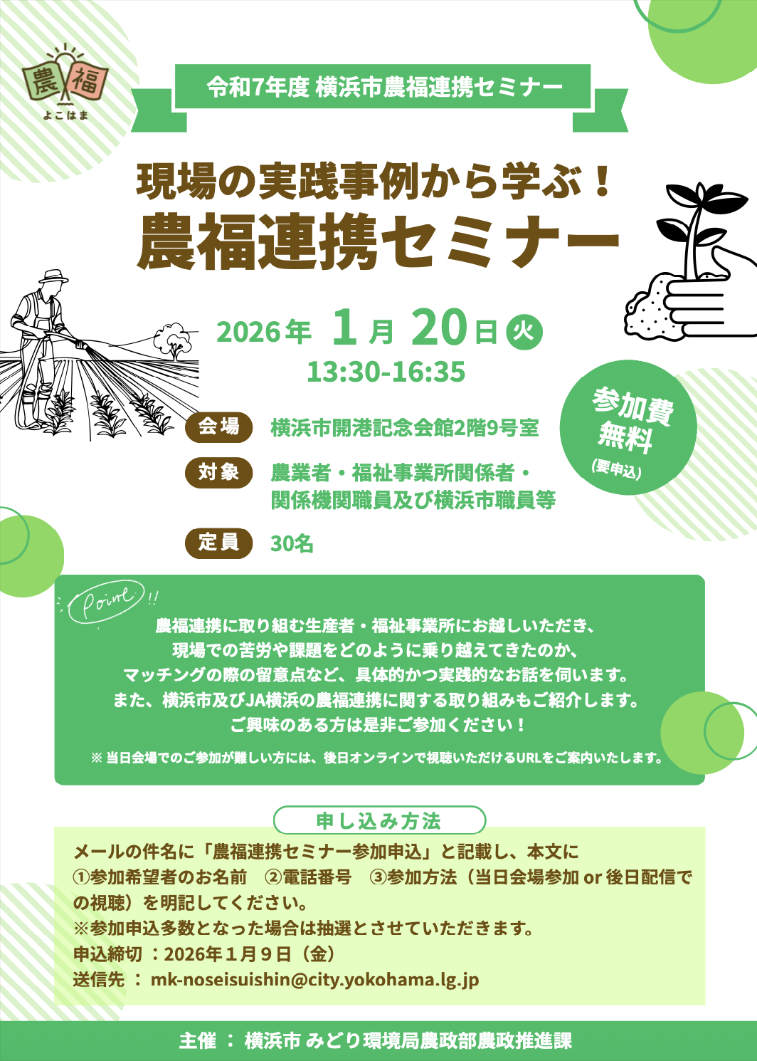 今年1月20日に横浜市が開催した農福連携セミナーでは、生産者や福祉事業所の皆さんから、現場の経験を伺いました。
