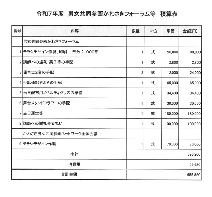 その費用はこちらの通り。講師の謝礼は10万円で、これは川崎市の基準ではフルプライスです。研修の講師なら10万円、著名人を呼んでの講演会なら20万円というのが上限になっています。さらに、200名の講演会のために作成するチラシが2000枚(9万円)、また川崎市の他の講演イベントでもよくある壇上の花(必要でしょうか?)が3万円で用意されています。