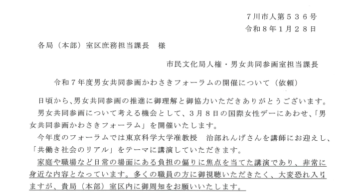 私は川崎市長選挙の際も、男女共同参画予算はほぼ自己目的化してしまっているから廃止すべきと言ってきました。実態を見ずにそう言い続けるのもの無責任だと思い、去る3月16日に開催された男女共同参画かわさきフォーラムに参加してみたのです。