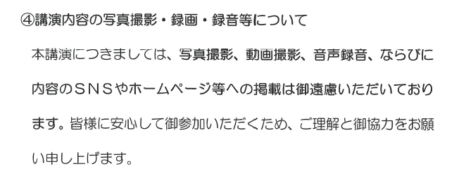 ちなみに、会場ではこんなことが書かれた紙が配られていました。録音撮影禁止は仕方ないとしても、内容のSNSやホームページの掲載はどこまで遠慮するべきなのでしょうか。税金で行われるイベントである以上は、本稿のような論評は許されて然るべきと思うのですが。
