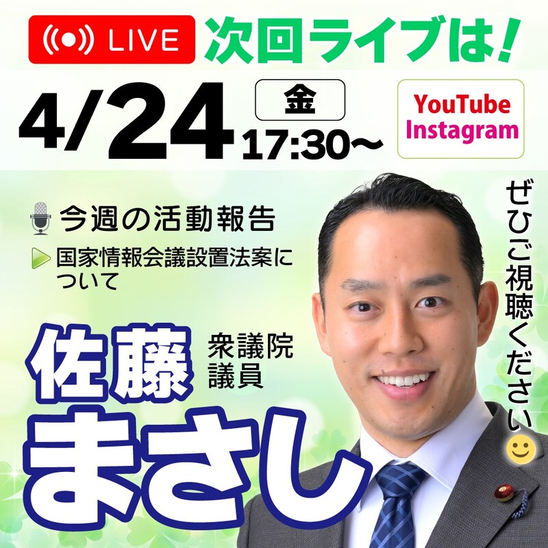 ホーム>政党・政治家>佐藤 まさし (サトウ マサシ)>📱💻❗️インスタ&YouTubeLIVE❗️📱💻金曜日はLIVEの日‼️LIVE配信だからタイ...