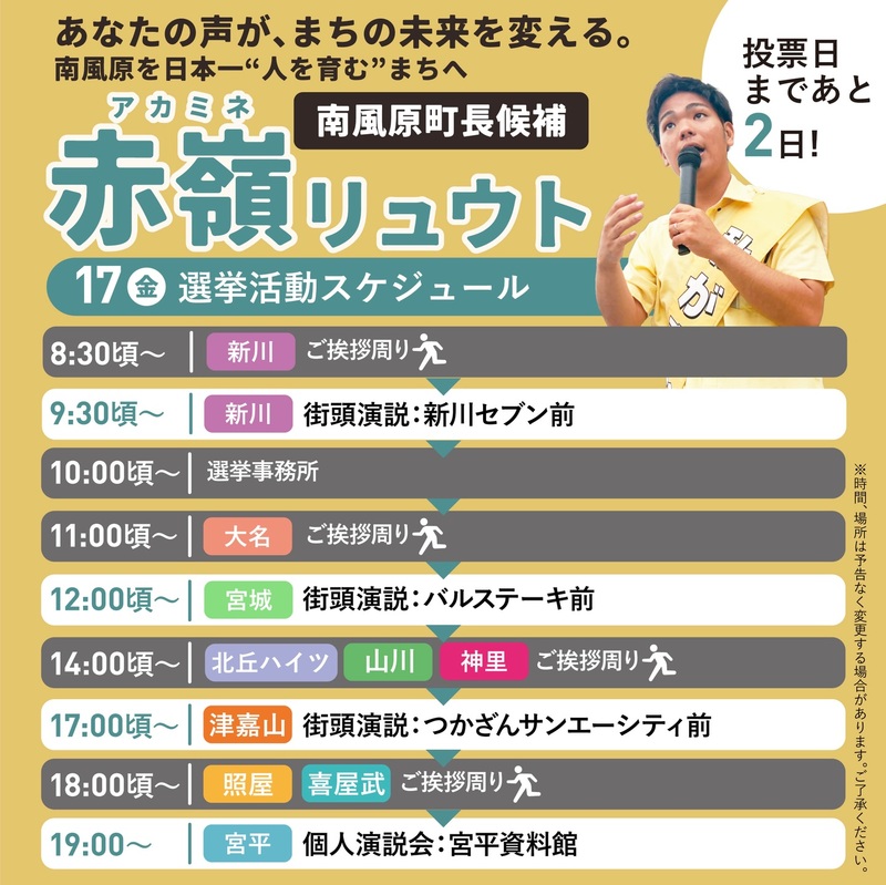 本日の選挙活動スケジュールをお知らせします。