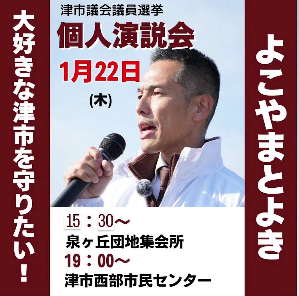 ホーム>政党・政治家>よこやま とよき (ヨコヤマ トヨキ)>本日1月22日は個人演説会を泉ヶ丘団地集会場・津市西部市民センターにて行います!
