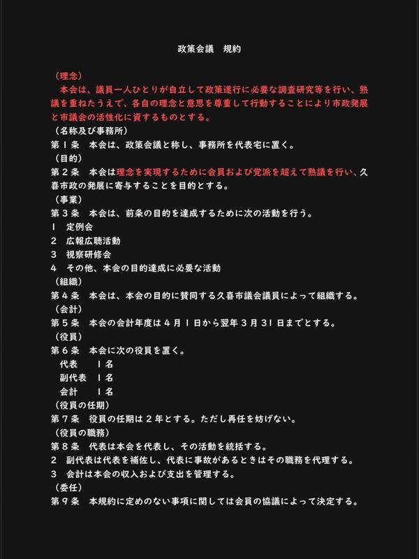 そのため会派の規約には議員個人の判断・責任と、会派・党派を超えて連携をする姿勢を記載しております。国民民主党の党是である「対決より解決」「つくろう、新しい答え」を体現した会派であり、久喜をより良くしてまいります。どうぞよろしくお願いいたします。