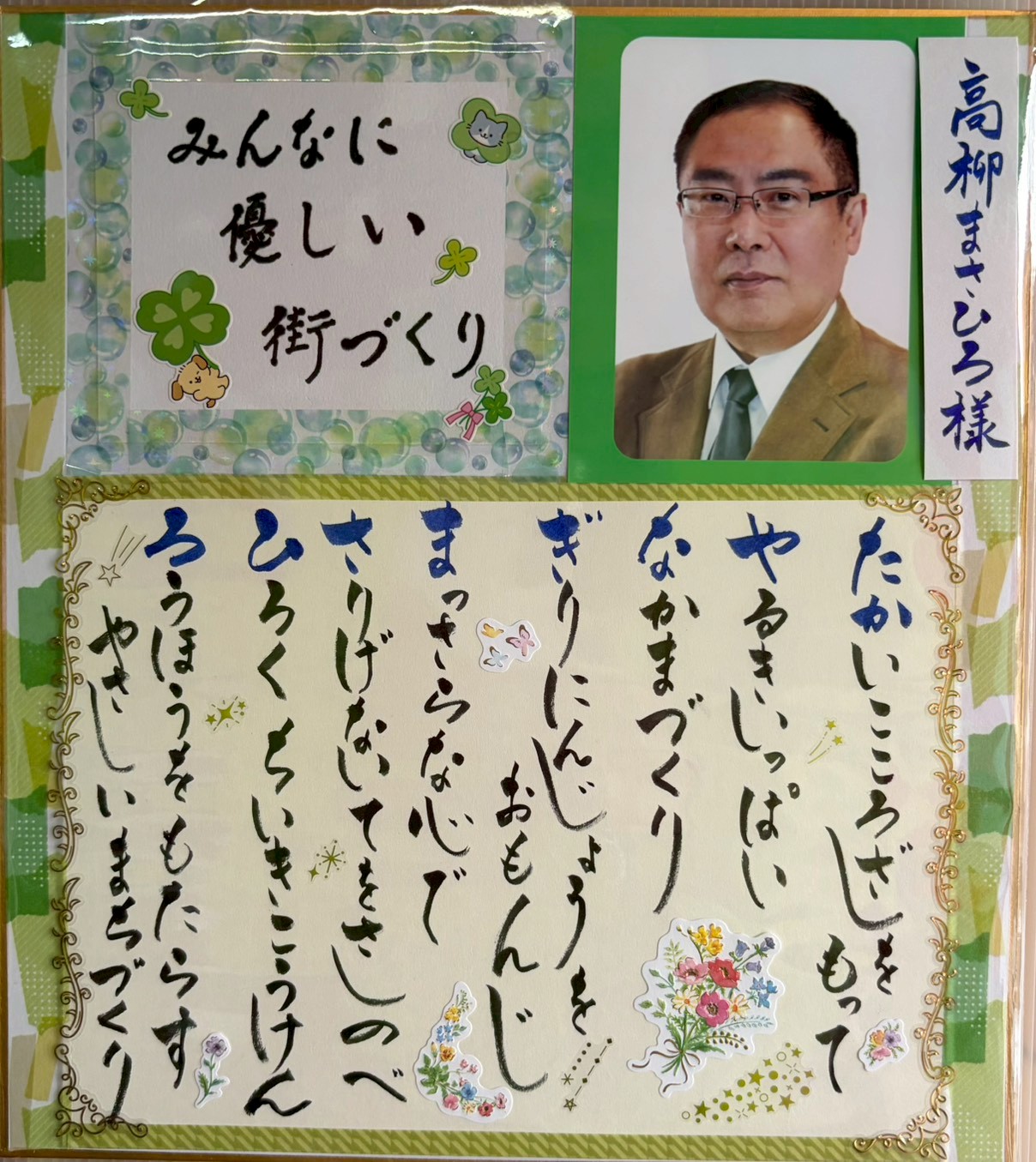 演説会の後日、上の写真のような色紙が、選挙事務所に届きました。私はこの色紙をいただき、議員としてということ以前に、一住民として、私たち住民自身が、お互いに優しくなれるような活動を、「みんなに優しい街づくりの会」の活動を更に大きくすることによって、実現していかなければならないという意を、より強くいたしました。