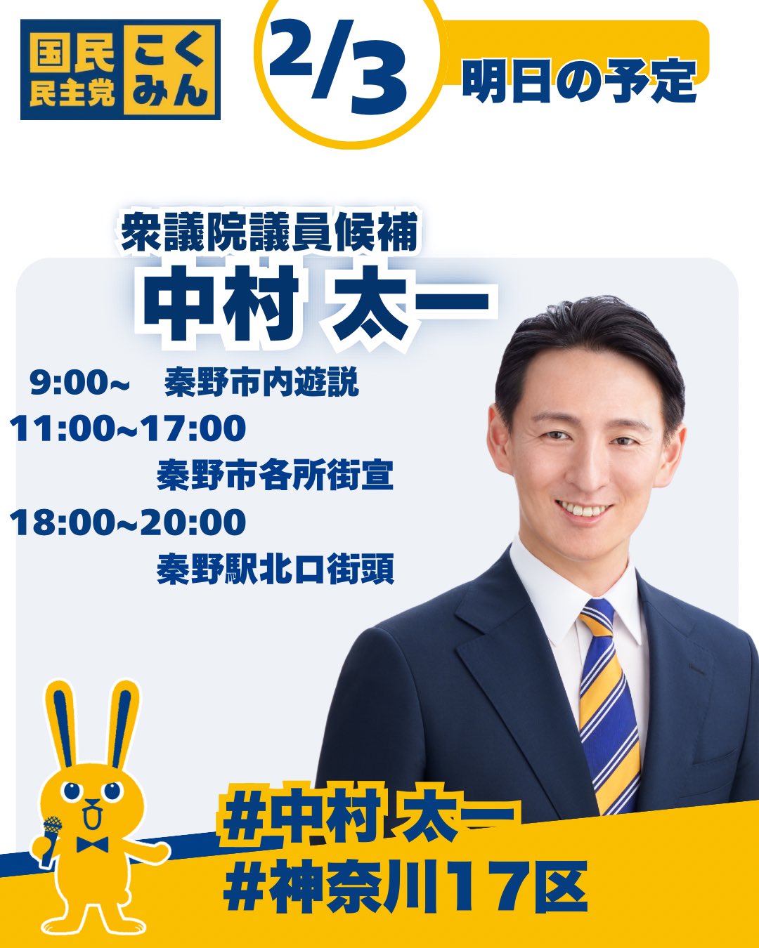 ホーム>政党・政治家>中村 太一 (ナカムラ タイチ)>2/3の予定のお知らせ