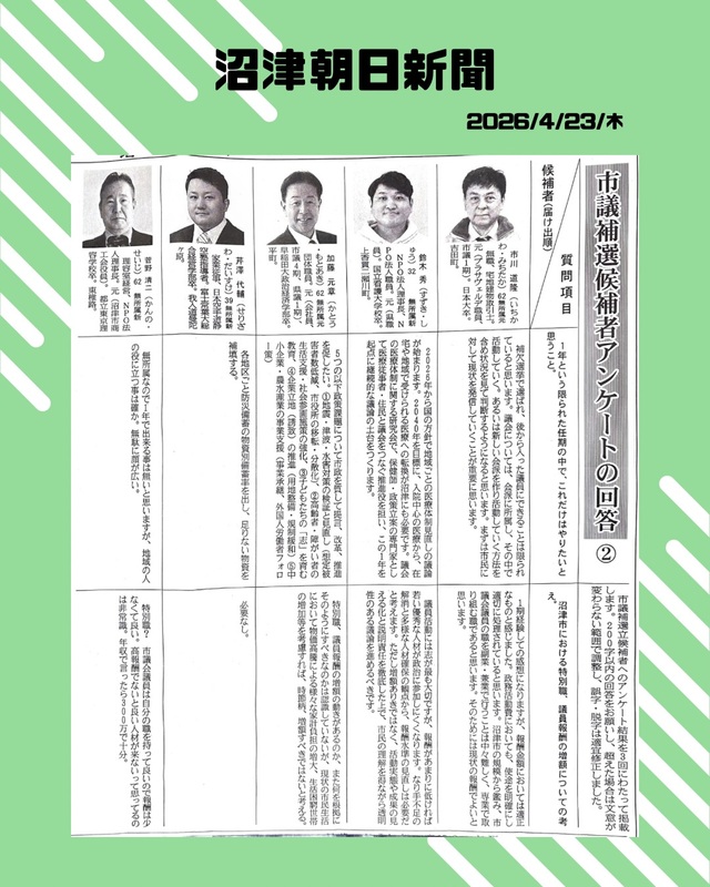 沼津朝日新聞さんのアンケートに応えさせていただきました。