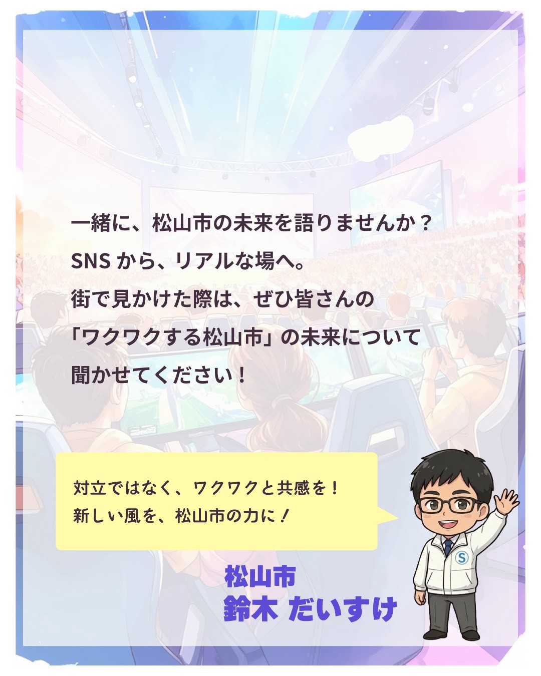 街で見かけた際は、ぜひ皆さんの「ワクワクする松山市の未来」を聞かせてください!
