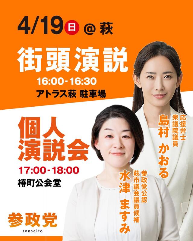 ホーム>政党・政治家>水津 ますみ (スイズ マスミ)>本日16時よりアトラス萩にて街頭演説そして17時より椿町公会堂(金谷天神様横)にて個人演説会で...
