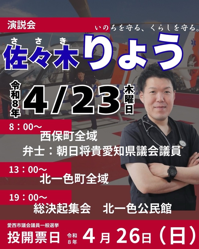 ホーム>政党・政治家>佐々木 りょう (ササキ リョウ)>本日4/23(木)、佐々木りょうが皆様の元へ伺います‼️朝から西保町、昼からは北一色町で熱い想...
