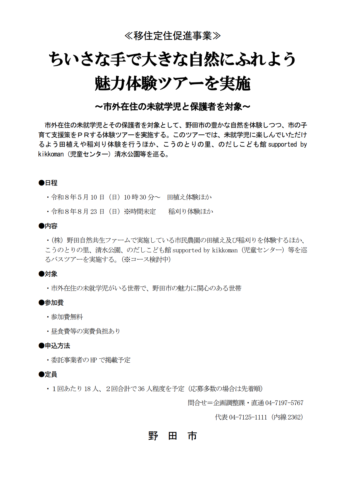 野田市が、市外在住の未就学児とその保護者を対象にした体験ツアーを予定しているようですね。