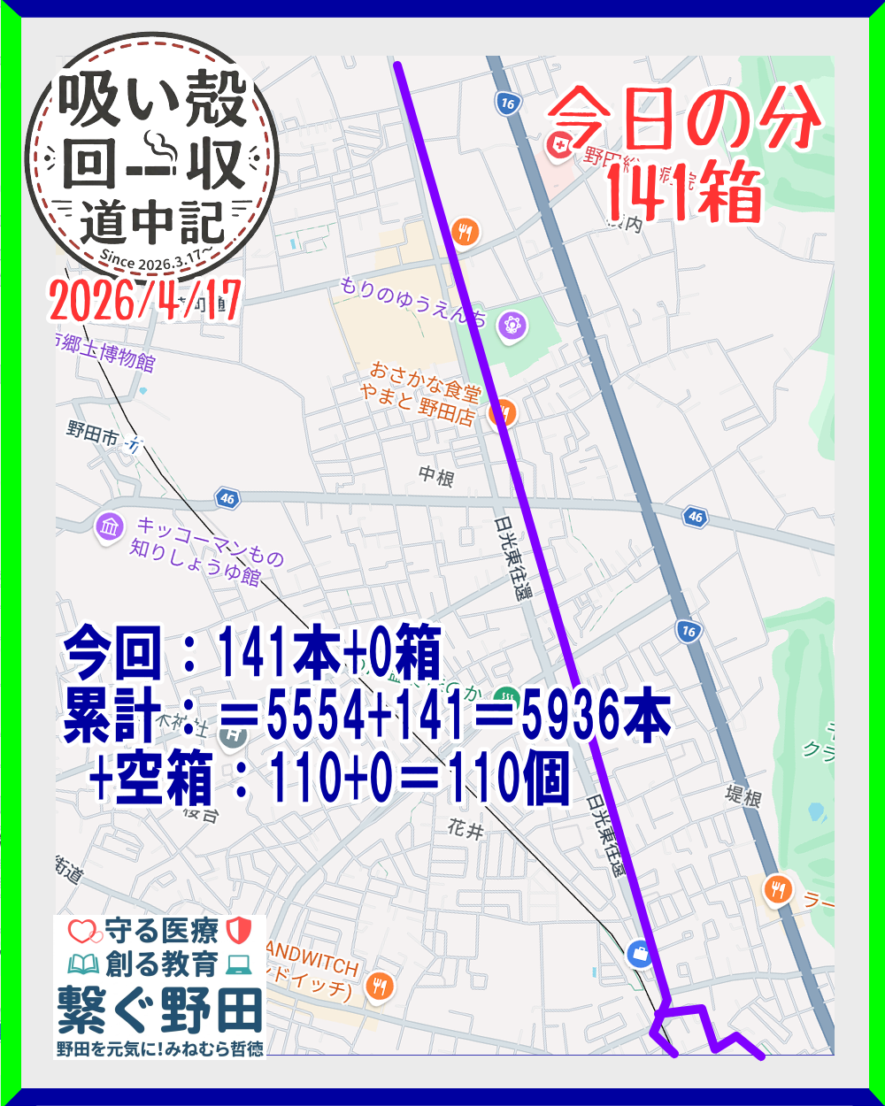 市役所方面の道はある程度拾っていたのですが、くら寿司のある交差点以降がほぼ未着手で、まあ吸い殻広いが捗ること・・・