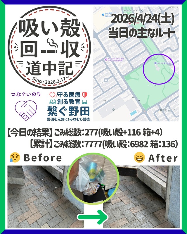 ホーム>政党・政治家>みねむら 哲徳 (ミネムラ テツノリ)>【繋ぐ野田】4/25のごみ拾い ~綺麗な野田を次世代に~