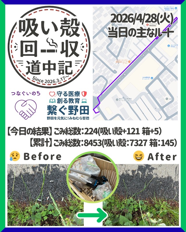 ホーム>政党・政治家>みねむら 哲徳 (ミネムラ テツノリ)>【繋ぐ野田】4/28(火)のごみ拾い ~綺麗な野田を次世代に~ごみ:累計8453個(+224)...