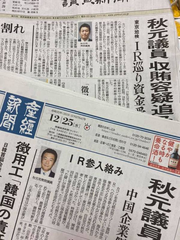 今朝の朝刊各紙の一面は、自民党の秋元司衆議院議員が収賄容疑で立件か?との記事で花盛りです。中国企業からIR絡みで金銭を受け取った疑いです。
