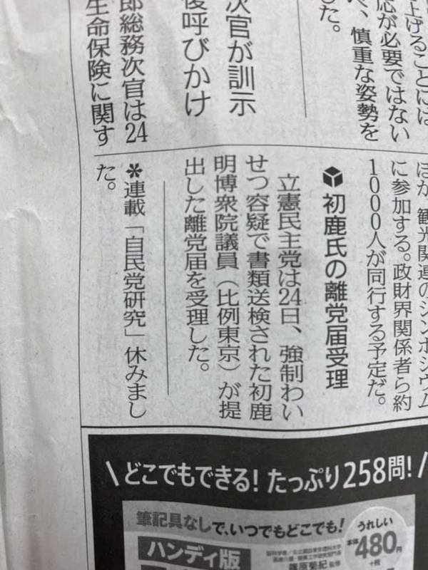 また、小さいながら、強制わいせつ容疑で送検された初鹿明博衆議院議員の離党届を立憲民主党が受理した、との記事もあります。