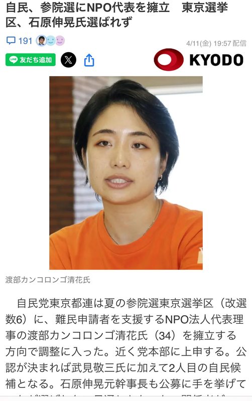 自民党東京都連は、参議院東京地方区の候補者に、ド左翼、反安倍派、反自衛隊の難民支援団体代表を擁立するべく党本部に要請したようです。