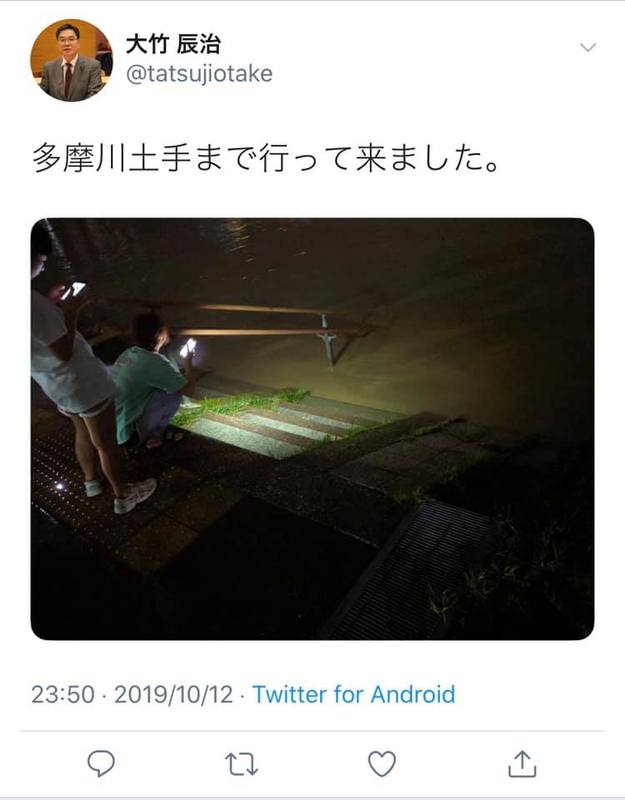 また、日本共産党大田区議団の最長老議員さん、よせばいいのに台風の最中、多摩川まで様子を見に行ったと自慢気にツイートしています。