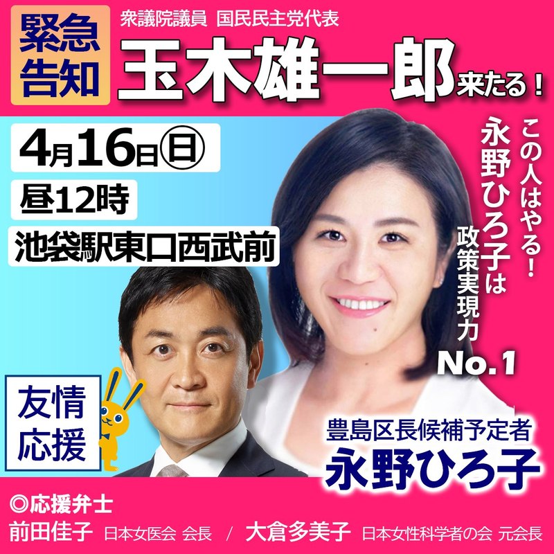 ホーム>政党・政治家>永野 ひろ子 (ナガノ ヒロコ)>【永野ひろ子 出陣式のご案内】4月16日(日)昼12時から池袋駅東口西武前◎国民民主党・玉木雄...