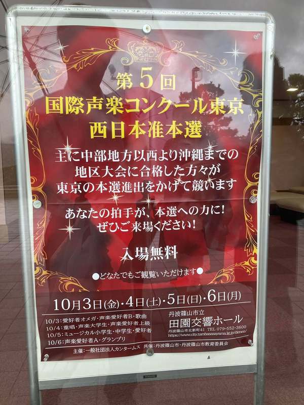 先週の4日土曜日、里山の食材と食文化・音楽のまちづくりで温かいまち起こしに努める丹波篠山しで、コンクール声楽愛好者上級部門の西日本准本選に出場しました。