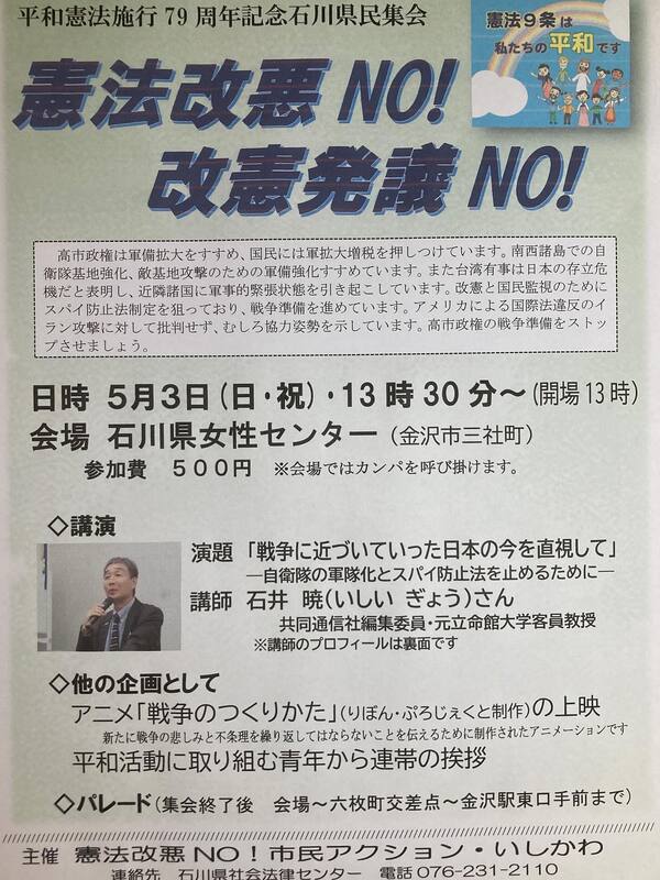13時半からは、三社町の女性センターホールで、県民集会を開きます。共同通信社編集委員石井暁さんを講師に招きます。ーチラシ参照ー