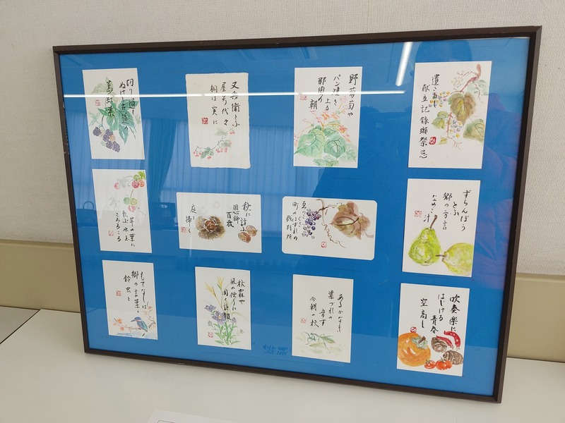 絵手紙、木彫り、絵画、俳句、工作作品などが展示されています。