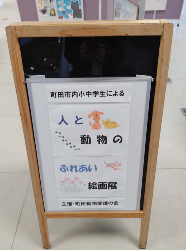 町田市役所1階のみんなの広場では、町田市内小中学生による「人と動物のふれあい絵画展」が、開催中です。