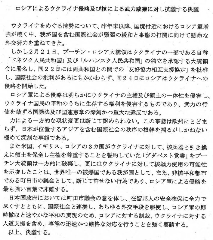 町田市議会は、昨日の本会議において、議員提出議案第1号「ロシアによるウクライナ侵略及び核による武力威嚇に対し抗議する決議」を全会一致にて可決いたしました。⇒https://www.gikai-machida.jp/voices/GikaiDoc/attach/Gk/Gk5483_2022-giin1gou.pdf