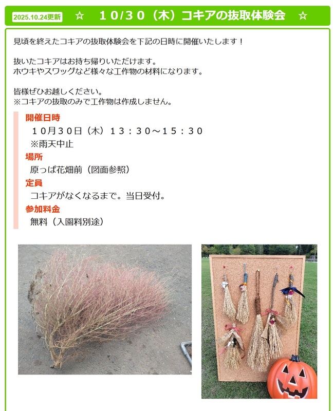 皆様ぜひお越しください。 ※コキアの抜取のみで工作物は作成しません。
