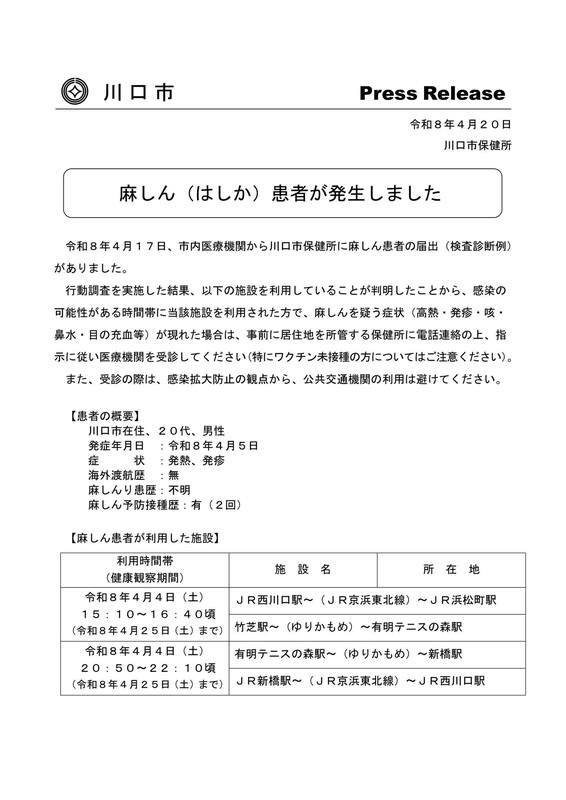 【#川口市】#麻しん(#はしか)患者が発生(4月20日)