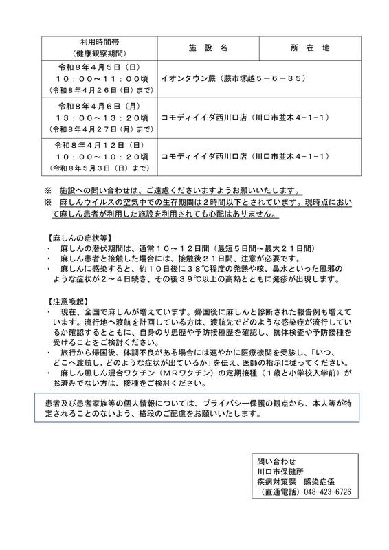 ホーム>政党・政治家>藤田 みつぐ (フジタ ミツグ)>【#川口市】#麻しん(#はしか)患者が発生(4月20日)JR西川口駅を利用しての移動ありhtt...