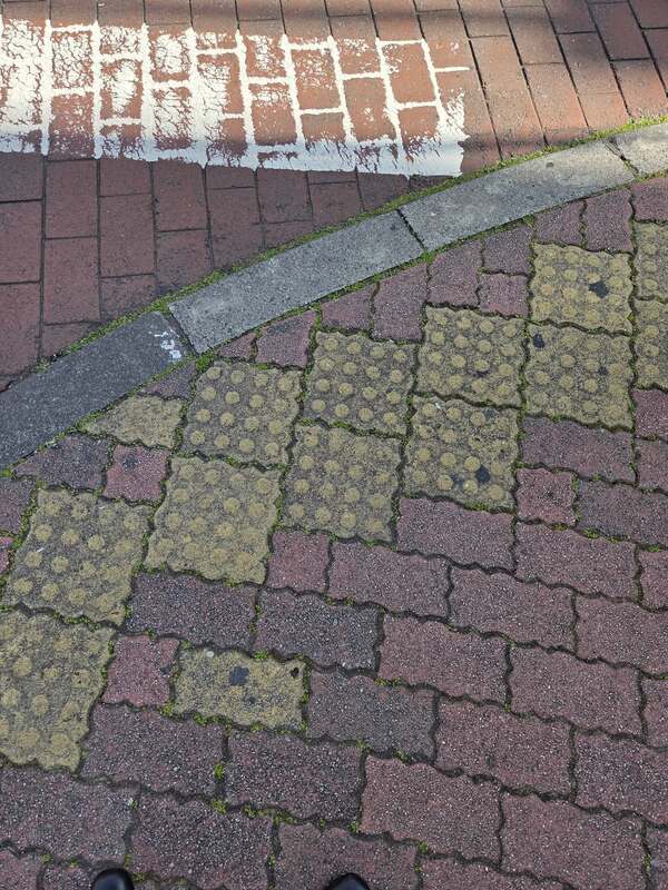 その先にある横断歩道には音響装置がなく、電車の走行音で車の接近音がかき消されてしまい、何度か危険な思いをされたことがあったそうです。また、私が調査した所、十字路の点字ブロックが経年劣化で凹凸がすり減っていました。
