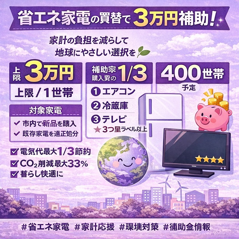 大洲市では、家計負担の軽減と温室効果ガス削減を目的に省エネ性能の高い家電への買い替えを支援しています
