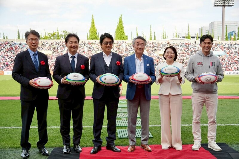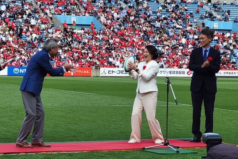 試合休憩中に開催された「寄贈セレモニー」では、廣瀬俊朗さん・元日本代表キャプテン→岩渕健輔さん・日本ラグビーフットボール協会専務理事→高橋克典さん→小村峰之さん・コムラエージェンシー社長→私、という順で、ラグビーボールのパスを受けました。