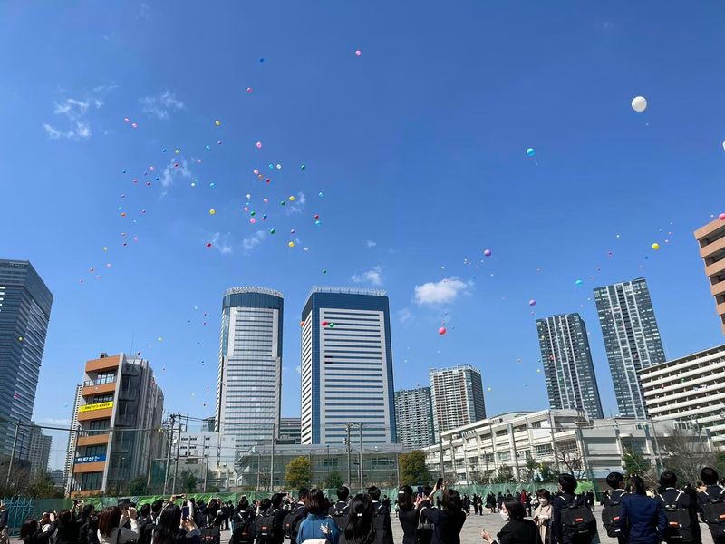 式典後は校庭でバルーンリリース。