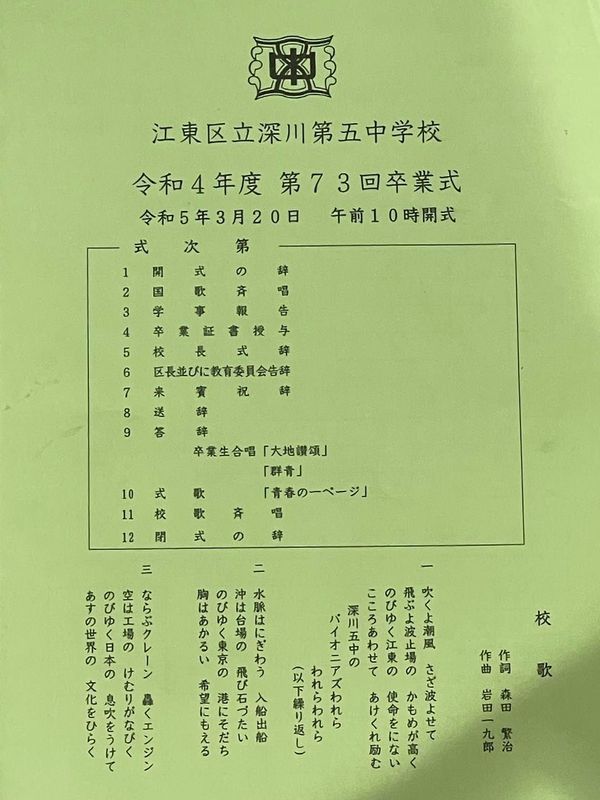 【深川五中卒業式〜3年ぶりの来賓出席】
