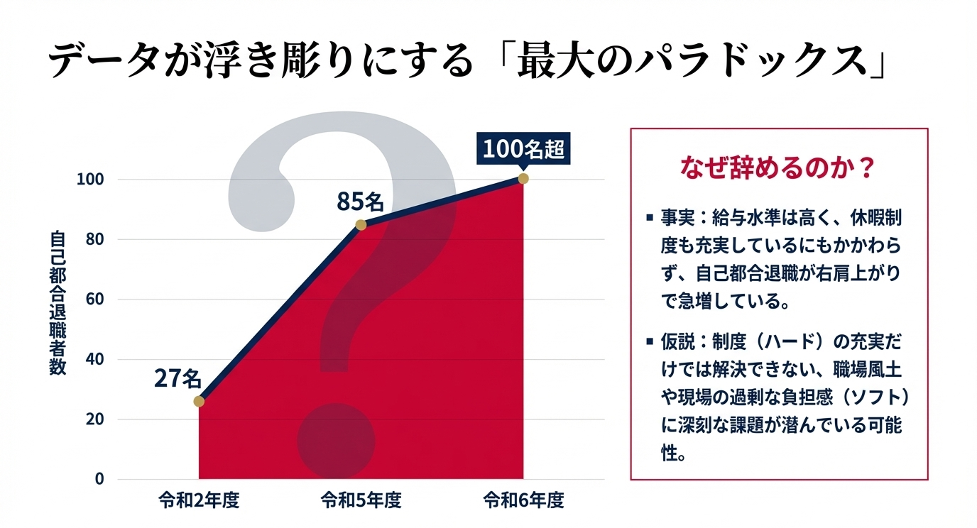 さらに、定年を待たずに退職する「普通退職者」が令和6年度には102人と、5年前の約2.4倍に急増しており、組織の「流出」が止まらない実態が明らかになりました。