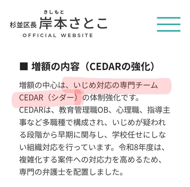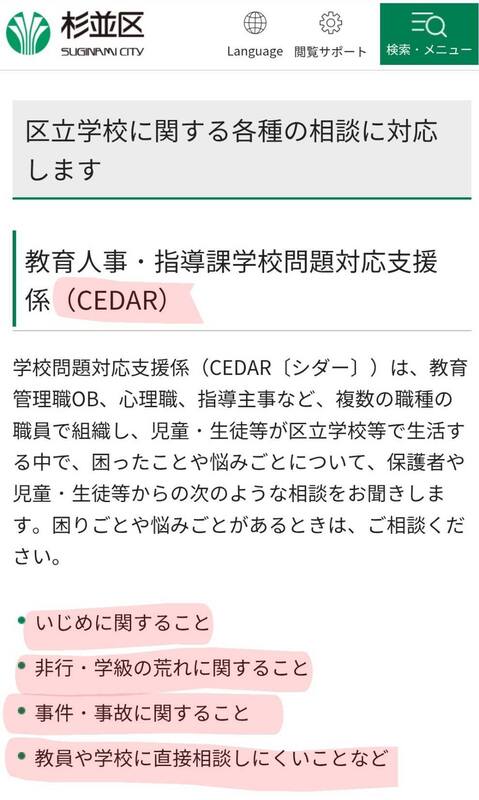 区立学校に関する各種の相談に対応するCEDARは、「いじめ対応の専門チーム」などではありません。