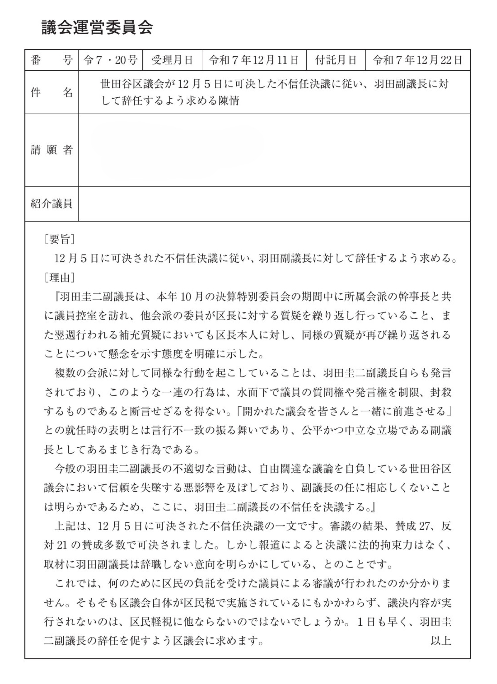 同時に、これも以前報告した(『羽田圭二副議長に対する不信任決議が賛成多数で可決』)世田谷区議会史上前代未聞となった羽田佳二副議長への不信任決議を受け、区民から辞任するよう求める陳情が提出されました。