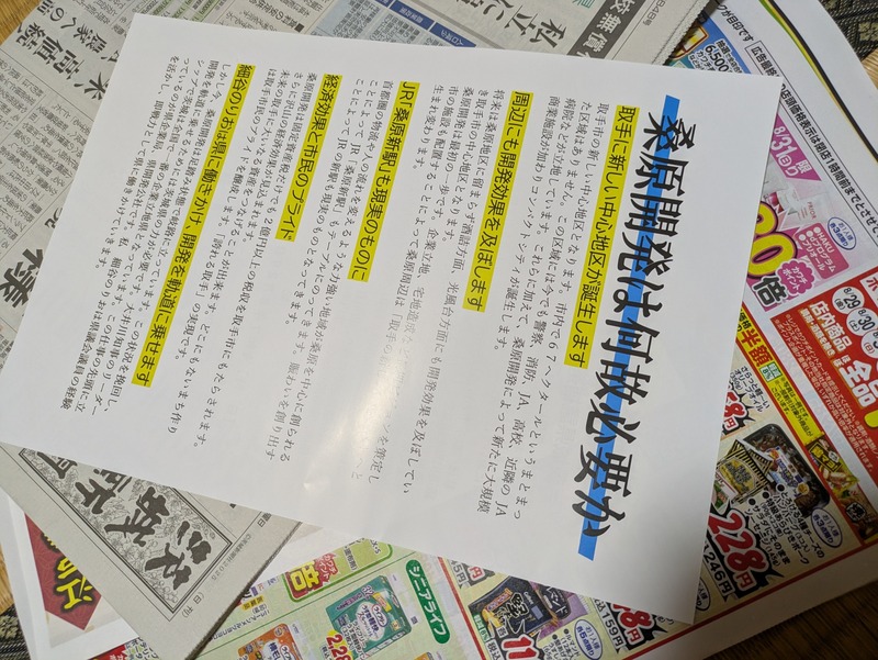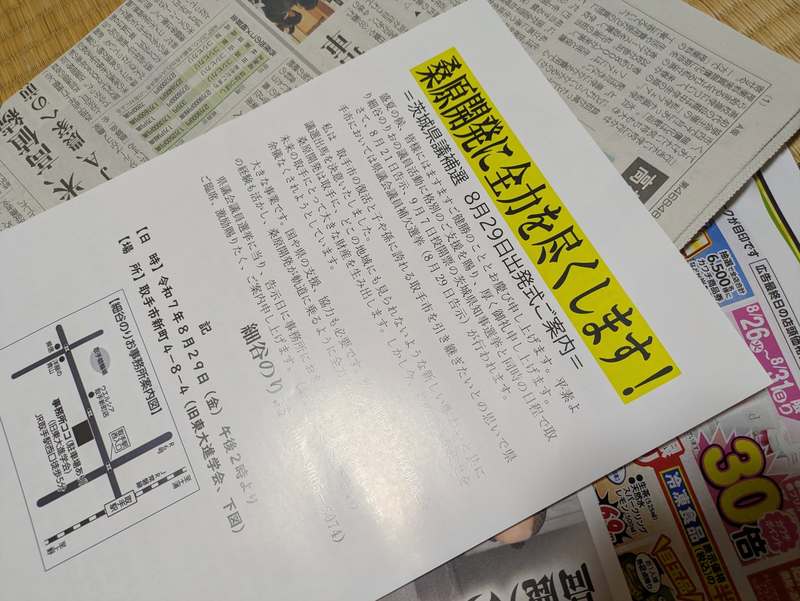イオン大型商業施設、ディズニーランドの1.3倍、取手市桑原に開発計画。これが今岐路に立っています。本日8月26日、取手市内のご家庭で購読いただいている新聞各紙に織り込みました。ご一読お願いします。
