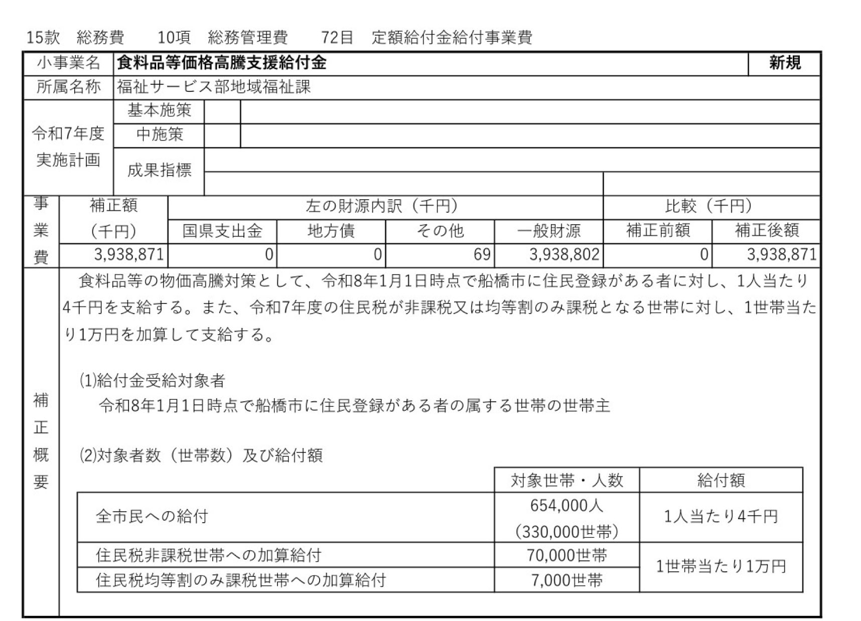 昨年(2025年)12月16日に国会で決議された「重点支援地方交付金」等で、船橋市民の生活支援のために40.8億円が支給されることになった。その給付内容・方法は自治体ごとに選ぶことができ、本日2026年1月15日(木)、船橋市長より以下の内容で提案された。