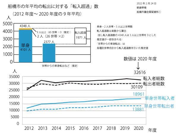 一方、単身世帯は1万8961人転入しておりまして、1万3881人転出しておりますので、単身世帯では5,080人増えております。このように、実は単身者の転入超過が船橋の人口増の基本的な増加となっているというふうに予測されます。