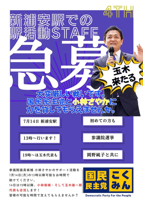 【明日】13時から新浦安駅前広場で街宣活動スタート、19時からは玉木雄一郎代表来援の街頭演説会!お仕事帰りにぜひお立ち寄りくださいませ!!!